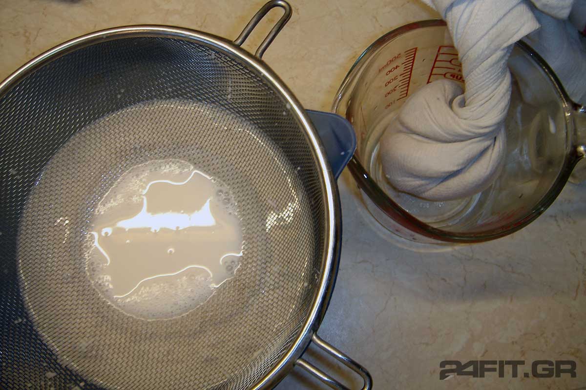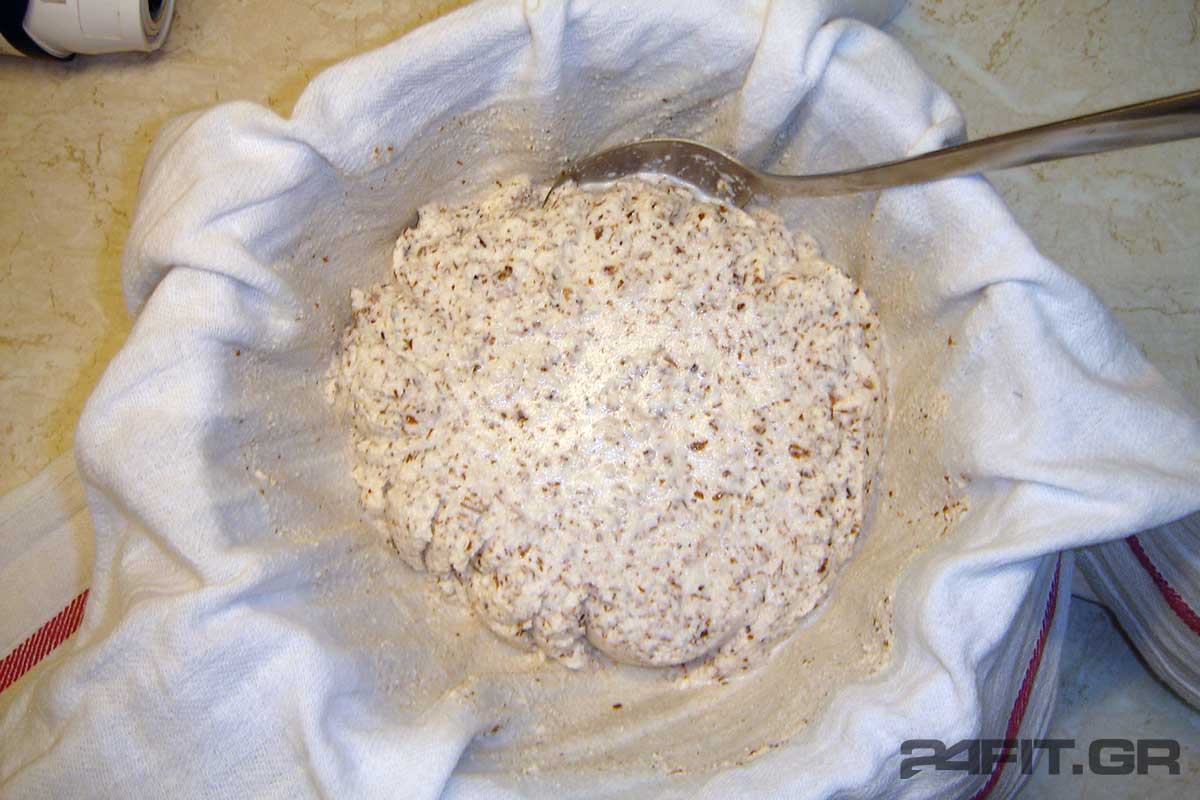 Ρίχνουμε το μίγμα σιγά σιγά πάνω στην πετσέτα και το αφήνουμε να στραγγίσει. Μπορούμε να βοηθήσουμε στο στράγγισμα ανακατεύοντας το μίγμα με ένα κουτάλι.
